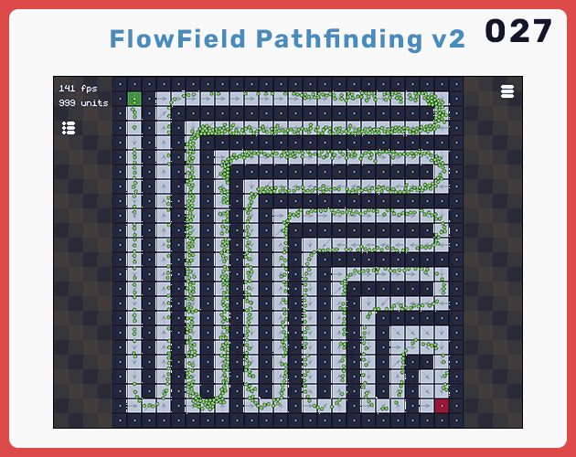 [Mar 18] 5h - FlowField Pathfinding Review [Mar 19] 7h - Diagonal Blocks / Corner Directions [Mar 20] 6h - Wall Avoidance [Mar 21] 7h - Wall Avoidance Fixed - Units will now completely avoid walls in it's pathfinding - Diagonal Walls now blocks completely in FlowField calculation - Tilemap Corner Collision causing stuck units - Units being pushed into another tile causes stuck units > stuck detection (same position for 0.1s) and solution (refreshes collision) - Kernel Convolusion creates direction loops - but skipping walls in the calculation fixes this (TODO: not fully) _sub_position = position for _wall in _wall_array: if _sub_position.x < _wall.position.x || _sub_position.y < _wall.position.y \ || _sub_position.x > _wall.end.x || _sub_position.y > _wall.end.y: # outside wall _wall_near = _sub_position.clamp(_wall.position, _wall.end) _wall_distance = _sub_position.distance_to(_wall_near) # always positive outside _wall_overlap = _radius - _wall_distance if _wall_overlap > 0: # 0 = circle is right at edge _wall_direction = _sub_position.direction_to(_wall_near) # + = circle inside rect _sub_position -= _wall_direction * _wall_overlap # - = circle outside rect else: _wall_near = _rectangle_closest_point(_wall, _sub_position) # inside wall if _sub_position != _wall_near: # push out wall _wall_direction = _sub_position.direction_to(_wall_near) else: # circle at rect border _wall_direction = _sub_position.direction_to(_wall.get_center()) * -1 # avoid (0, 0) _sub_position = _wall_near + (_wall_direction * _radius)